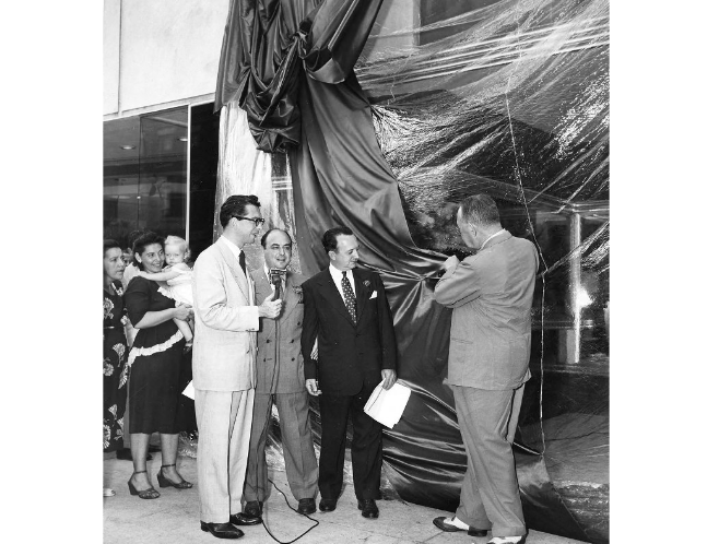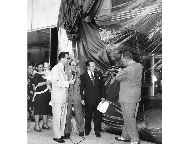 A building in front a new jewelry store was wrapped in cellophane with a big ribbon around it for its grand in Alexandria, Virginia, 1950 (Series VII, Box 7, Folder 5 ‘Uses of Cellophane’, DuPont Company Product Information photographs (Accession 1972.341), Audiovisual Collections and Digital Initiatives Department, Hagley Museum and Library, Wilmington, DE 19807).