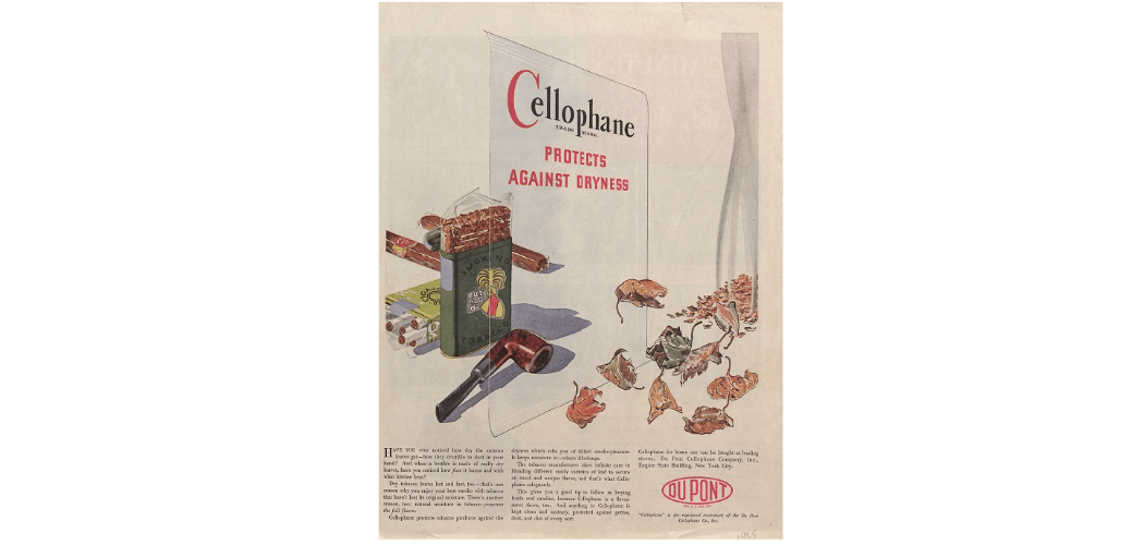 Ad showing cellophane’s water-proof capabilities, 1935 (Series I, Box 43, Folder 14, ‘Advertising tearsheets – 1935’, E.I. du Pont de Nemours & Company Advertising Department records (Accession 1803), Manuscripts and Archives Department, Hagley Museum and Library, Wilmington, DE 19807).