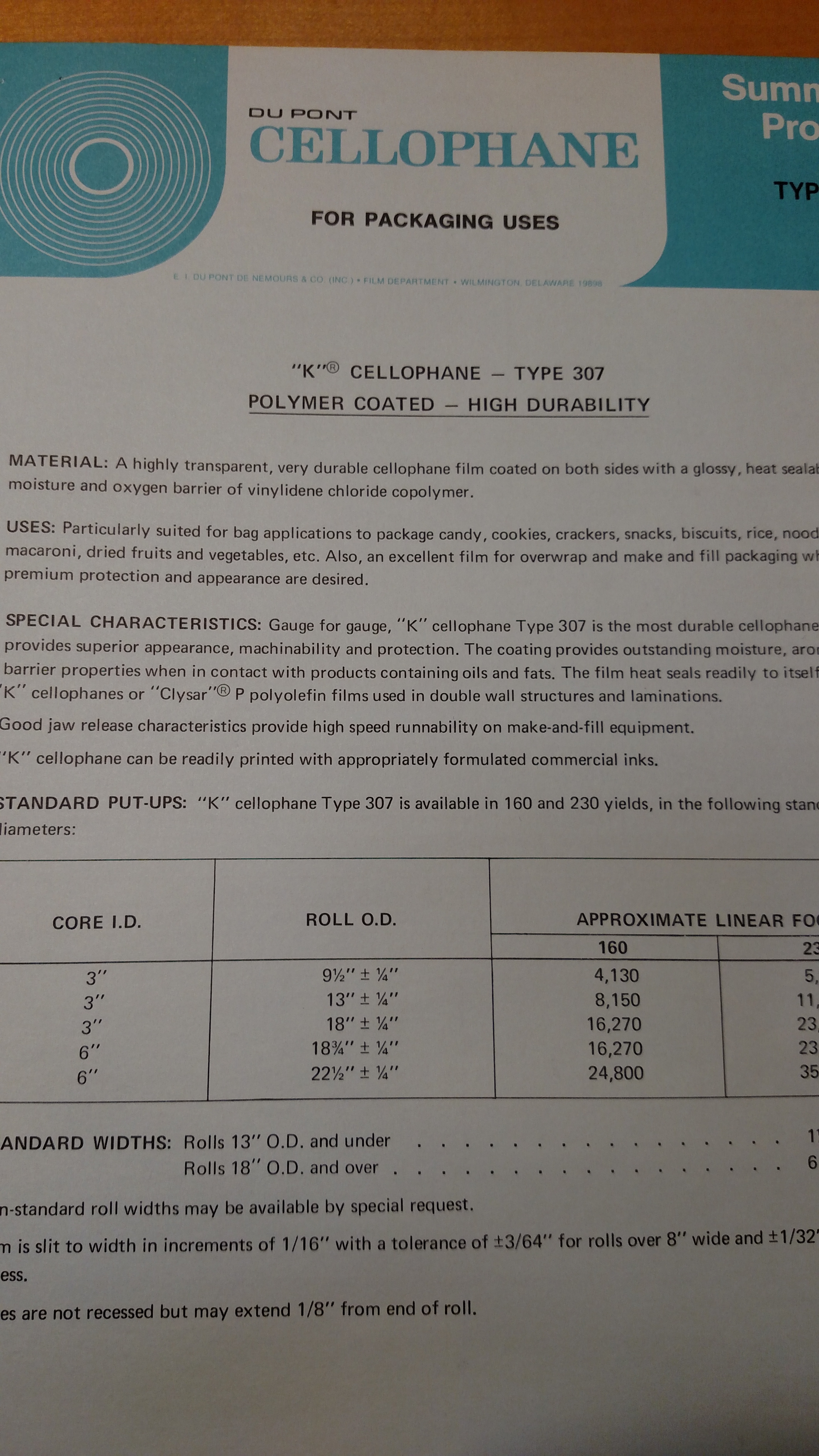Sales materials for DuPont clients describing a type of cellophane suitable for dry goods (Box 13, Folder 13, E.I. du Pont de Nemours & Company Lavoisier Library archival collection (Accession 2632), Hagley Museum and Library, Wilmington, DE 19807).