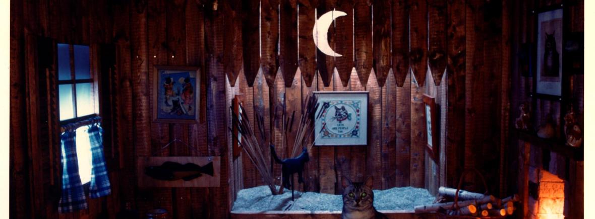 One photo features a pristine, white long-haired cat perched, its front paws crossed, on a cushioned chair in a pink room, complete with chandelier. The caption typed on the back of the photograph reads: “The chandelier is pure crystal. The jewels are priceless trinkets from the Far East. And the gold throne, reminiscent of Louis XIV, is filled to the royal brim with Kitty Litter Brand cat box filler. It’s a room designed for feline fantasies; a Persian’s paradise created by Lowe’s, Inc., to honor cats of all kinds during National Pet Week May 5–11, 1985.”