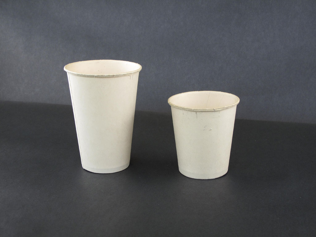 (left) First rolled brim cup (7 oz., plain white), 1918; (right) Penny vendor cup (5 oz., plain white), 1915. (Hugh Moore Dixie Cup Company Collection, Special Collections and College Archives, Skillman Library, Lafayette College.)