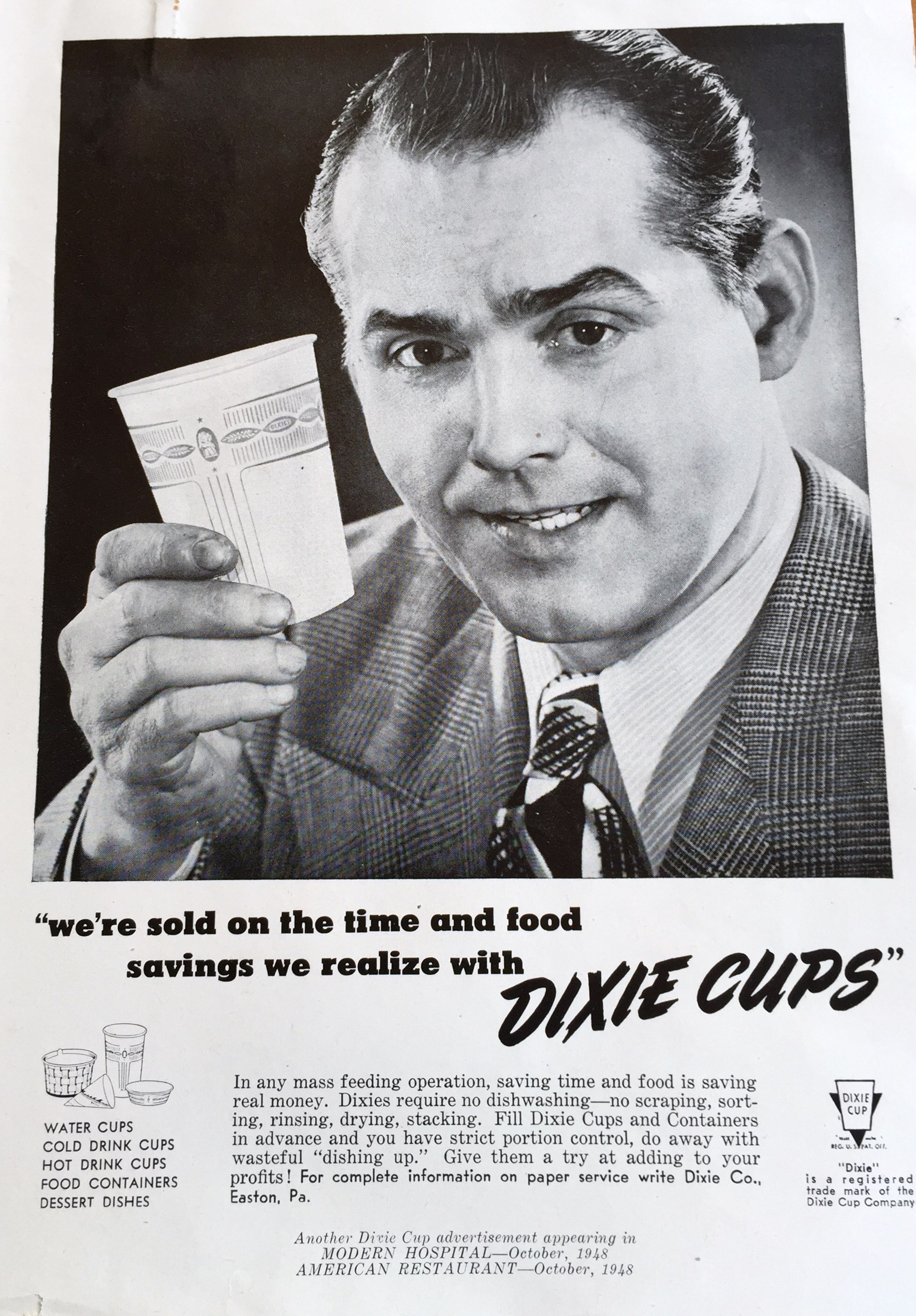 Dixie advertisement for Modern Hospital and American Restaurant, 1948. (Hugh Moore Dixie Cup Company Collection, Special Collections and College Archives, Skillman Library, Lafayette College.)
