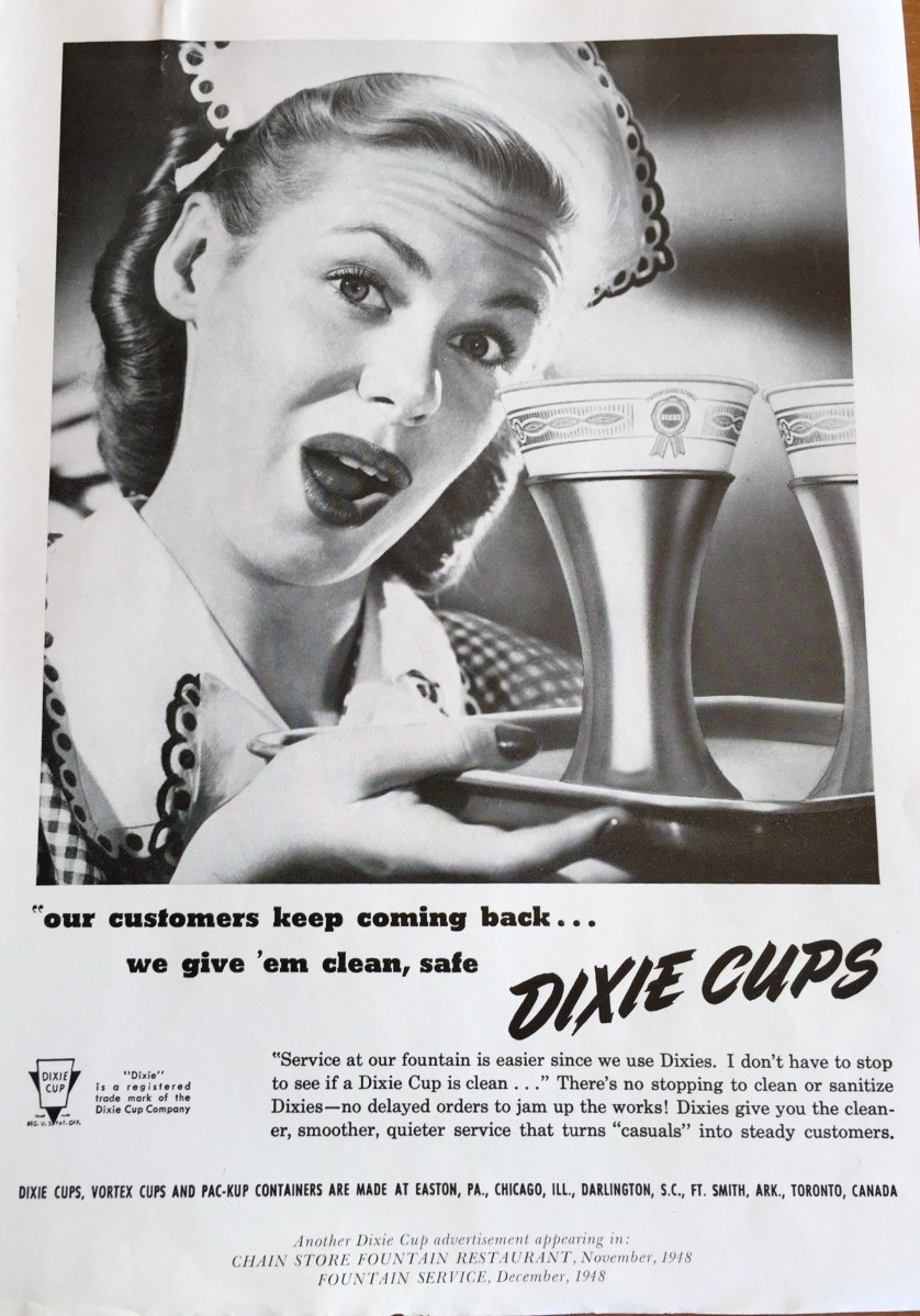 Dixie advertisement for Chain Store Fountain Restaurant and Fountain Service, 1948. (Hugh Moore Dixie Cup Company Collection, Special Collections and College Archives, Skillman Library, Lafayette College.)