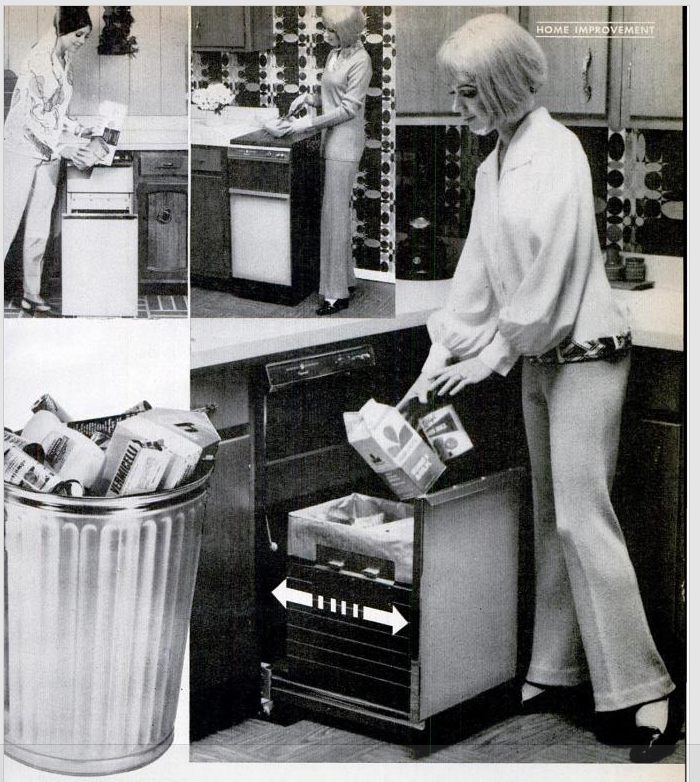 Another strong thread running through trash compactor promotion was that of environmental benefits. The trash compactor emerged at a time when the discourse of waste management was incorporating environmental health, as well as public health. Because it reduced waste volume and could save landfill space, promoters of the appliance argued that it “should gain acceptance by ecologists.” Whirlpool touted it as “forerunner of a whole new generation of appliances that will help improve the quality of the environment.” If we can believe in the integrity of Popular Science magazine, then this did turn into a motivation for consumer purchase; a personal use report noted a trash compactor “postpones the day when we’ll drown in a sea of trash.”
