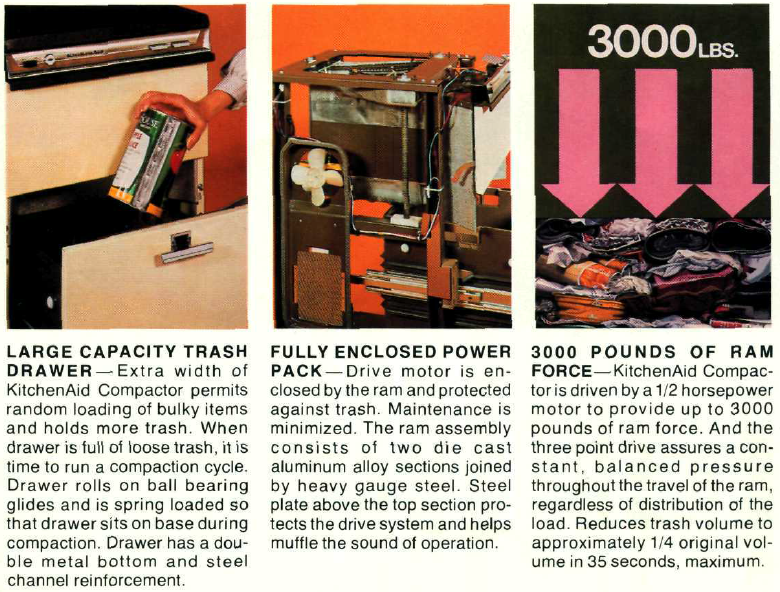 Hobart Corporation. KitchenAid Trash Compactor. (A-681). Hobart Corporation, 198?. Emphases on “large-capacity,” “power pack”s and “raw force” also targeted male consumers.