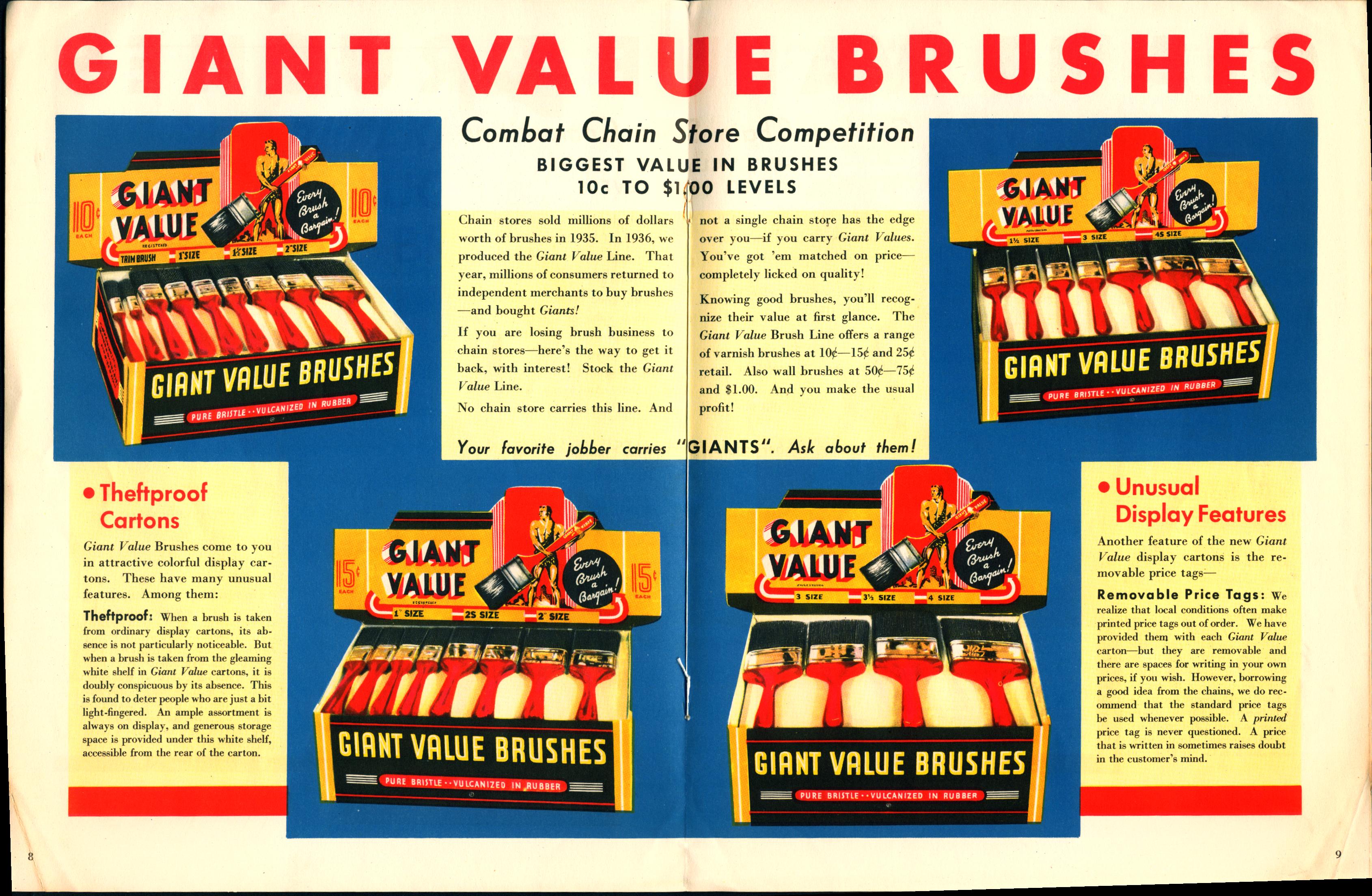 “Giant Value Brushes” advertisement from a merchandising catalog. Paper, Superkleen Brushes, 1938. Courtesy of the Hagley Museum and Library, .S9626 1938 TRCAT.