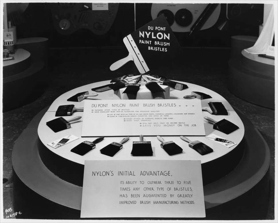 Display of nylon plastic paint brush bristles. Photograph, E.I. du Pont de Nemours & Company, 1948. Courtesy of the Hagley Museum and Library, digital collections, 72270_810.tif.