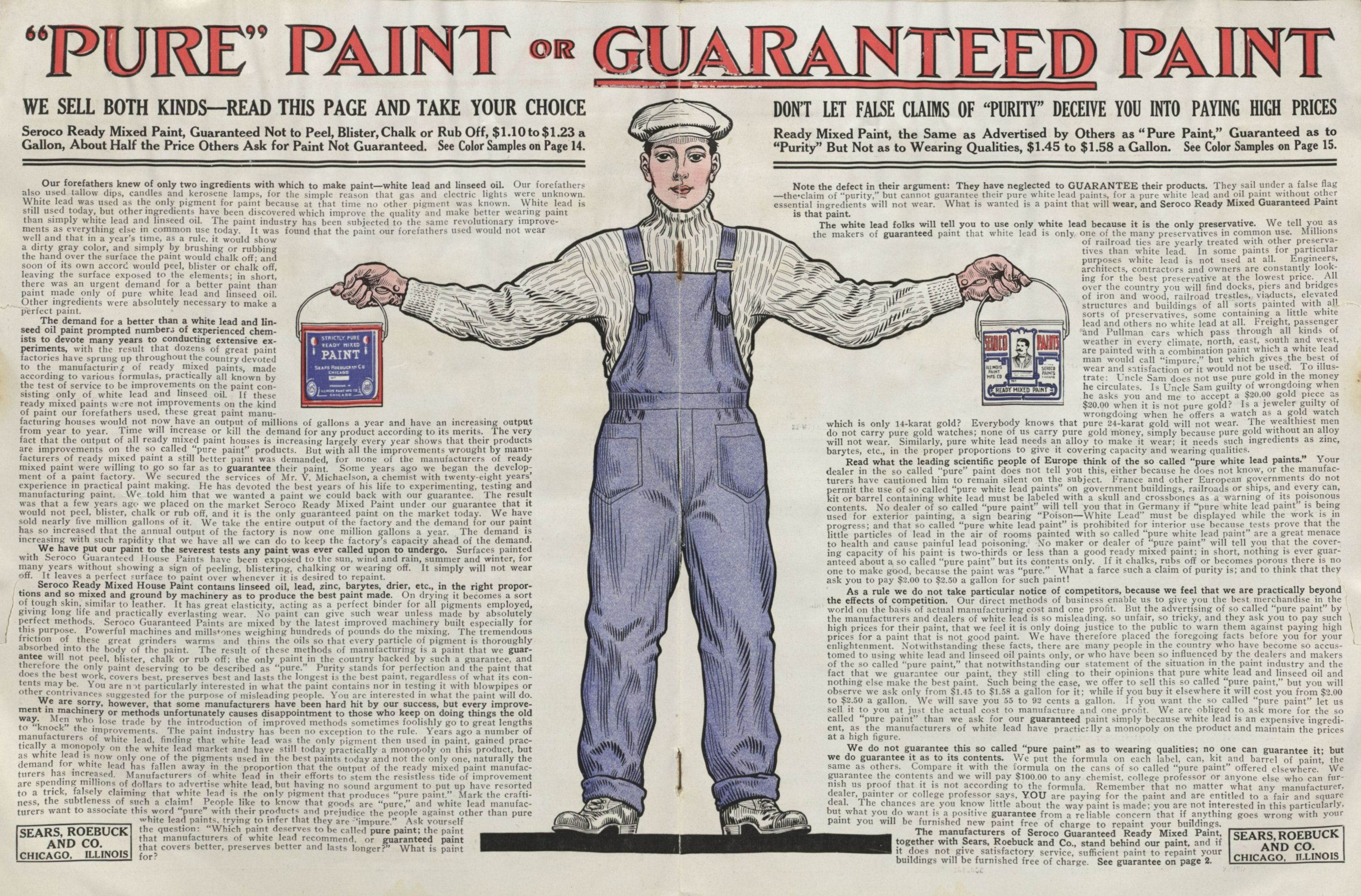 “Guaranteed” ready-mixed Seroco Paints advertisement featuring and targeting professional painters, who now had the option not to mix their own materials. Trade catalog, Sears, Roebuck & Co., 1908. Courtesy, The Winterthur Library, TP937 S43 TC.