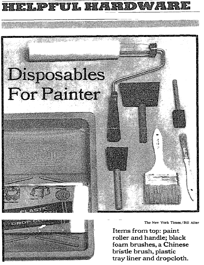 Beyond the foam brush and the inexpensive roller cover, consumers of painting supplies encountered a host of other disposable products after the 1950s. Flat applicators with replaceable pads emerged as effective tools for cutting in corners and edges. Throwaway plastic tray liners and dropcloths, as well as plastic and cardboard paint buckets, appeared in retail stores next to their sturdier durable cousins. Home-improvement articles and manuals sometimes recommended that consumers don disposable gloves while working and lay cardboard and newsprint to catch drips and splatter. Manufacturers and experts intended for these items both to ease cleanup and to land in the rubbish bin.