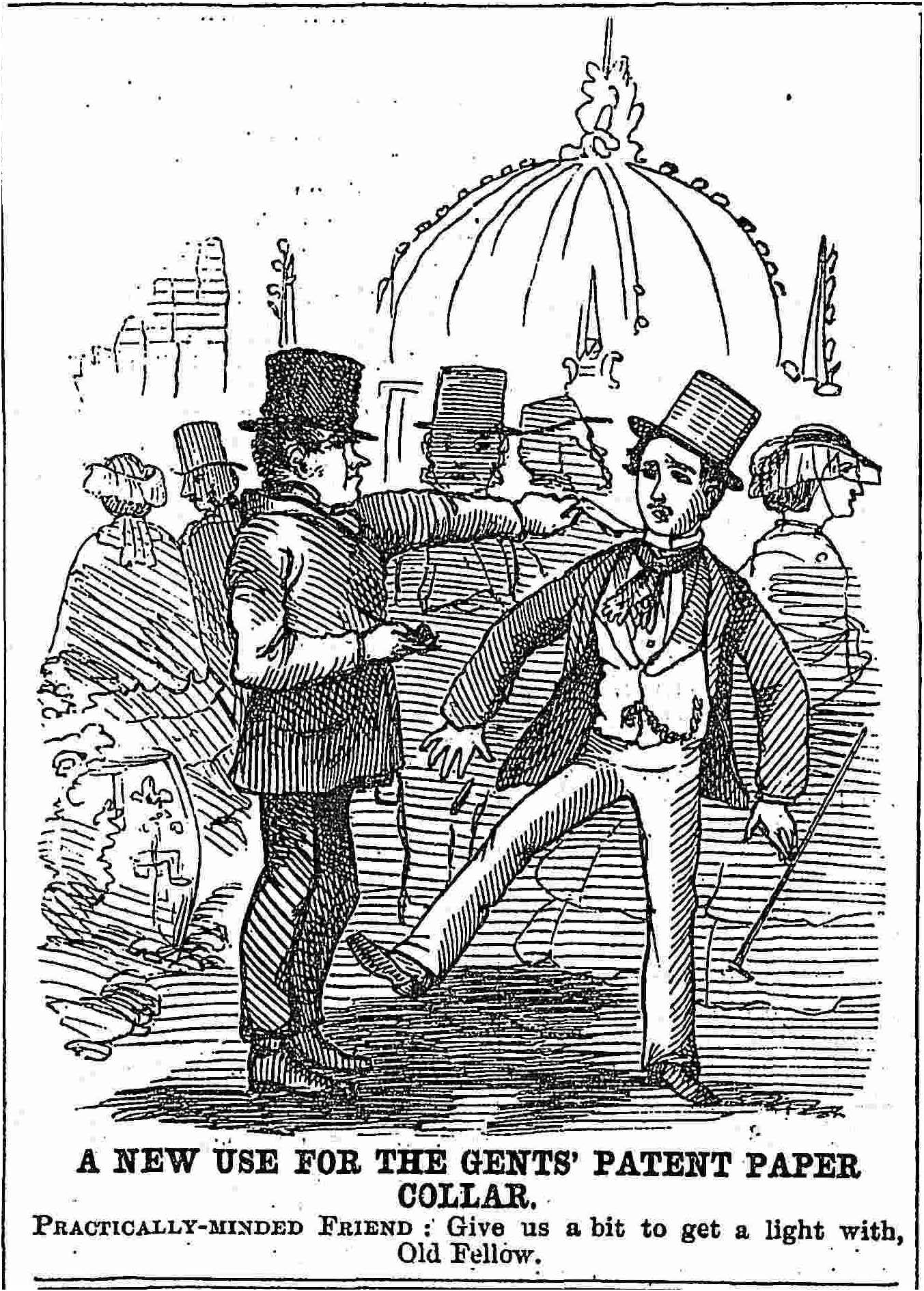 When paper clothing first arrived on the mass market, it had not yet hardened into a touchstone for class identity. Like Howard Paul in “The Age of Paper”, commentators recognized its potential usefulness, but they also felt awkward about replacing their fine linens with something so mundane and ephemeral. In 1858, a cartoon in Australia’s Melbourne Punch magazine showed one man tearing off a piece of another’s paper collar as tinder to light his pipe.