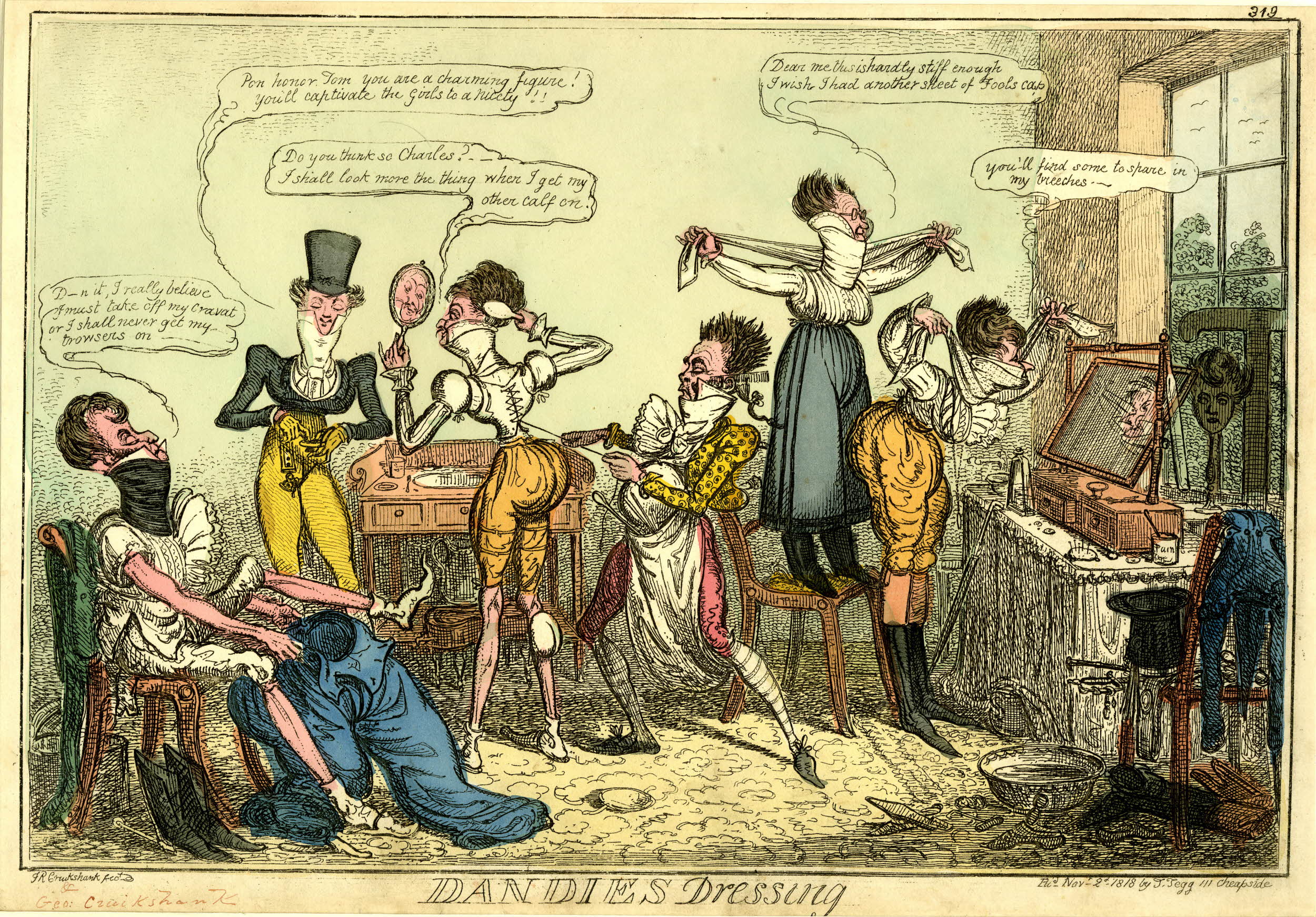 Hand-colored etching, “Dandies Dressing,” by Robert Cruikshank, 1818. Dandies were defined, in part, by the unnatural pains they took in their grooming and dress. As Cruikshank’s satirical cartoon suggests, these habits often invited charges of effeminacy. In a time when office work seemed like a radical departure from the masculine labors that had upheld the economy in the past, clerks who overdressed were doubly susceptible to being called effete. (©Trustees of the British Museum)