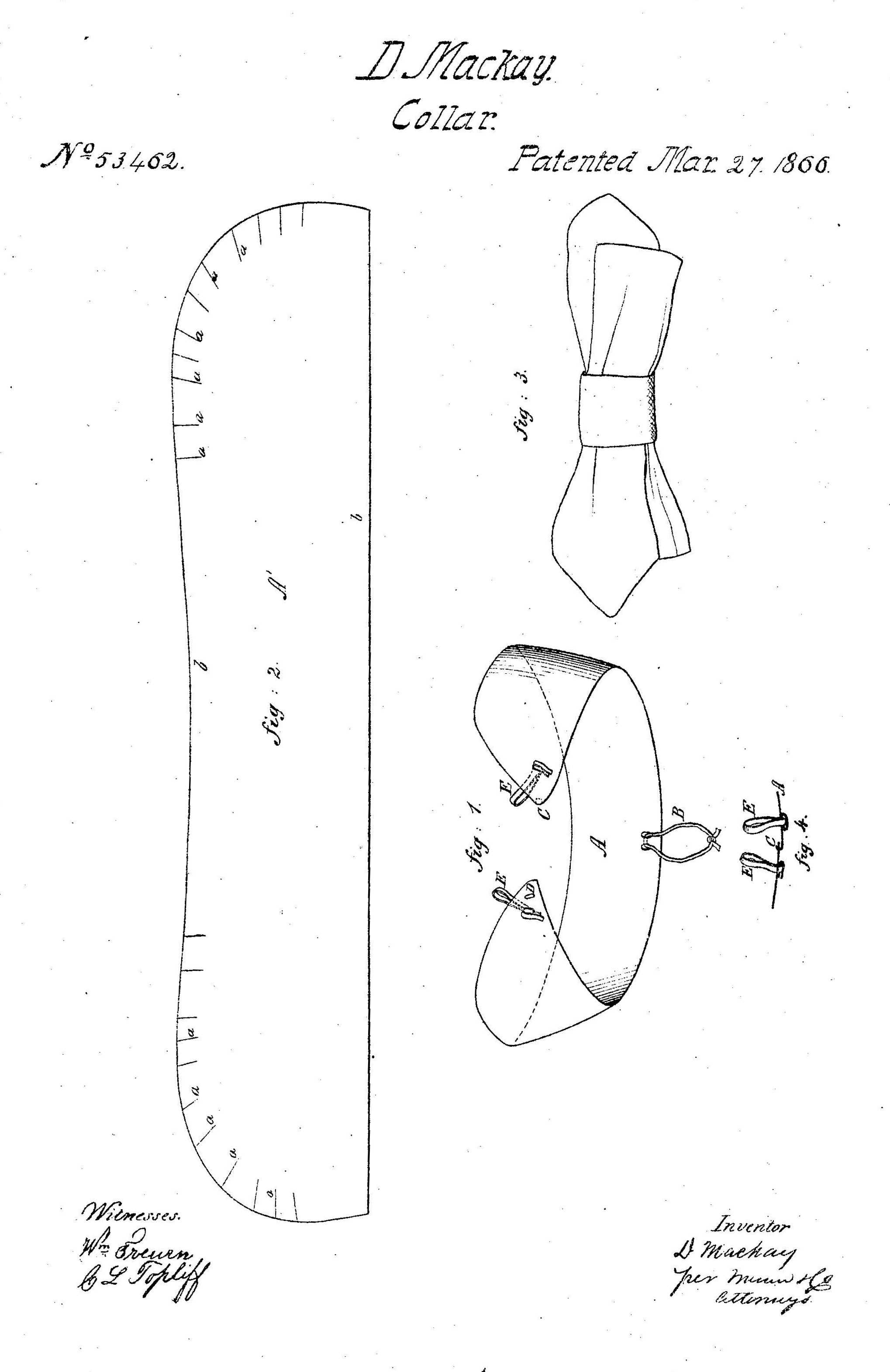 - Nathaniel Evans, Jr., patent drawings, U.S. Patent 41,692 (1864). Cutting and folding the collar on a curve caused it to sit more naturally around the neck.
