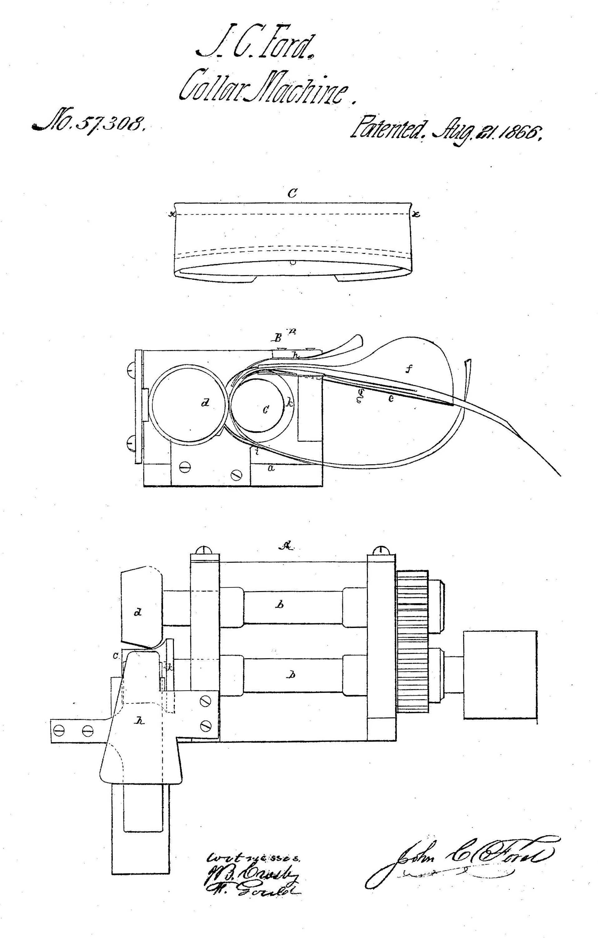 John C. Ford patent drawings, U.S. Patent 57,308 (1866). The machine’s rollers could press a flared contour into the fold of a collar to keep it from cutting into the neck.