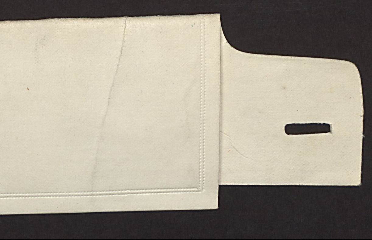 Paper collar, showing typical vulnerability to cracking and curling. It bears a stamp that reads “Hunt’s Patent,” dated 1854, but the design incorporates later technology. More likely, it was made in the 1860s by W. E. Lockwood, who had acquired Hunt’s patent rights. (Photo courtesy of the Costume Institute of the Metropolitan Museum of Art. C.I.40.133.5, gift of Mrs. Bella Landauer, 1940. http://www.metmuseum.org)