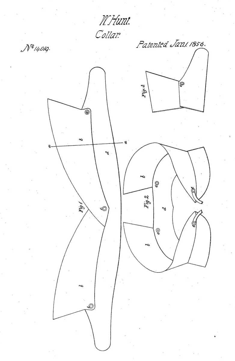 William Hunt patent drawings, U.S. Patent 14,019 (1856). Hunts collar is designed in multiple pieces to allow flexibility and prevent cracking.