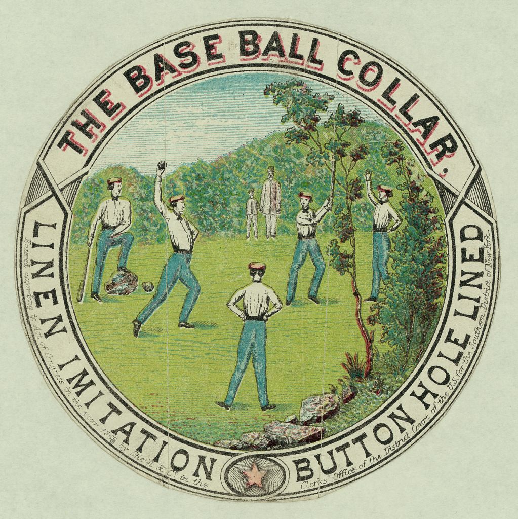 Box label for the “Base Ball Collar,” late 1860s. The buttonholes were reinforced with cloth to prevent them from giving out when weakened by perspiration. Whether or not one wore them for sporting, the branding and packaging suggested high performance.