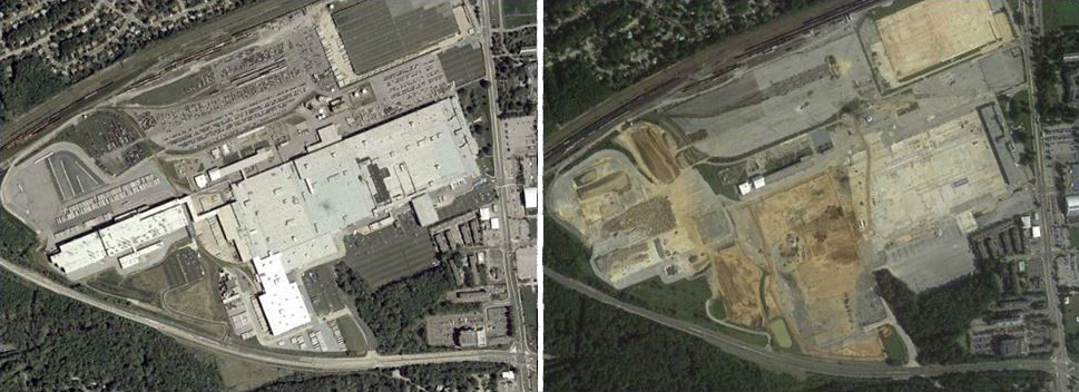 The Chrysler Newark Assembly Plant, before and after demolition. In the United States, disposability extends even to the built environment, and industrial infrastructure is particularly susceptible. The image on the left shows the site as it appeared circa 2002, the image on the right shows the site after demolition, circa 2012. Note the enormous footprint of the plant, 3.4M ft² or 78 acres, the highway connections to the south and east, the railroad siding to the north, and the surrounding residential and green spaces which form the environmental context of the site. Image credit: © 2002, 2012 United States Geological Survey.
