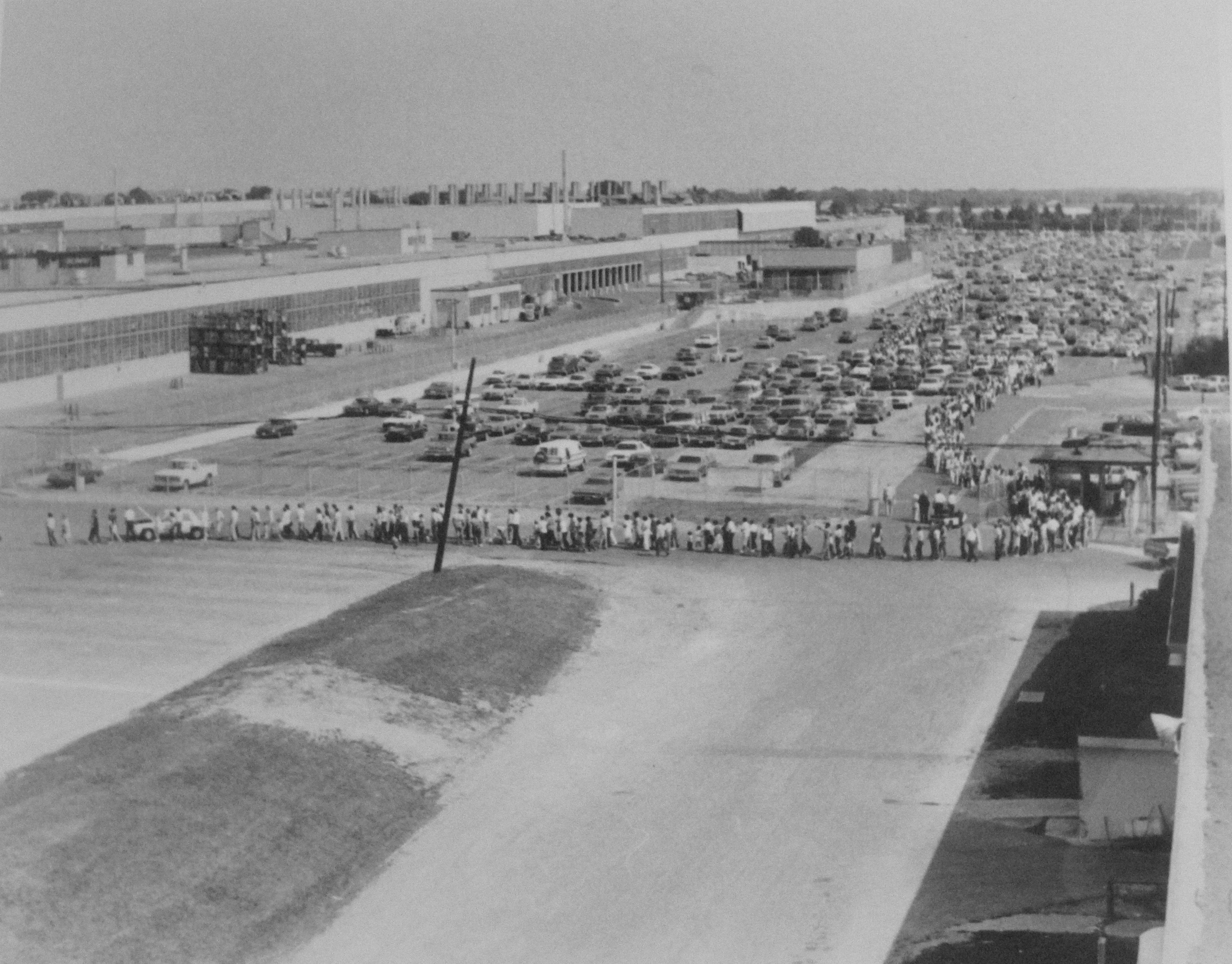 This image shows a portion of the Chrysler Newark plant and its surroundings, circa 1984. The people lined up are there for Family Day 1984, an event that brought the larger community into the plant for hot dogs, raffles, and work exhibits. Image credit: University of Delaware Library Special Collections.