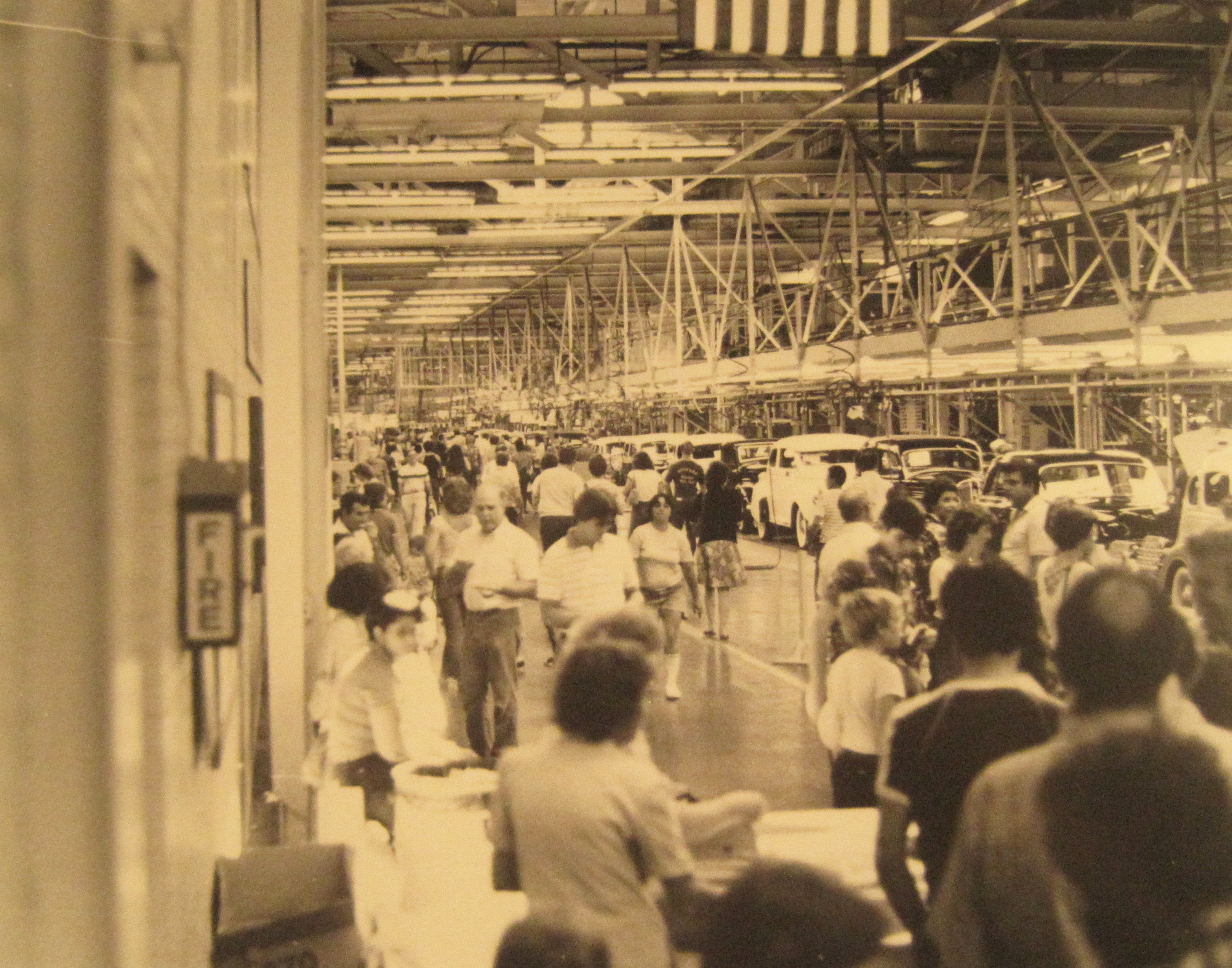 Crowds of locals rub shoulders on the factory floor during Family Day 1984. The structure of the plant is revealed by the crisscrossing girders, the artificial lighting, and the convergence of lines toward a distant vanishing point. Image credit: University of Delaware Library Special Collections.
