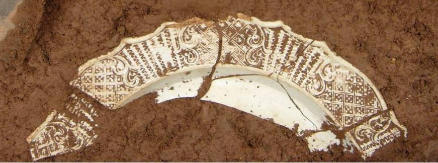 The plate has an elaborate dot-diaper-and-basket border pattern that dates to about 1755 to 1770; plates in this pattern have also been excavated at Mount Vernon and Colonial Williamsburg. The location and large size of this plate rim is noteworthy. White salt-glazed stoneware was used for dining, not food preparation or storage. This plate belonged in the dining room, yet its location in the ground indicates that it was discarded from the kitchen. Perhaps it was broken by an unruly dinner guest or a clumsy servant. It could also have broken after the meal, when dirty dishes would have been brought into the kitchen for cleaning.