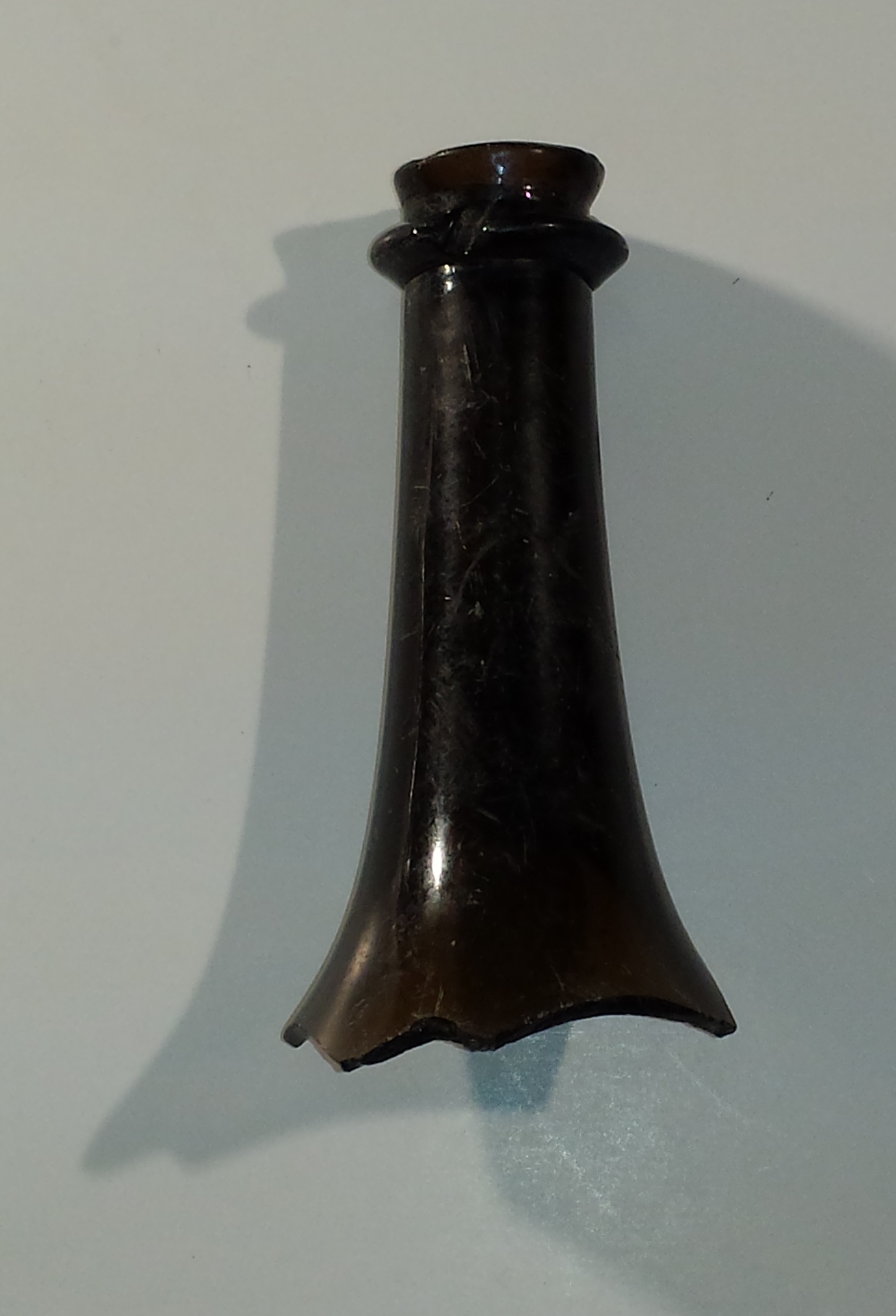 The second bottle fragment is the neck of a dark green or “black” glass bottle; the relatively straight sides and narrow, tapering shoulder indicate that it dates to the mid-to-late 1700s. Although this bottle dates to the Muhlenberg period of ownership, it was unfortunately found by archaeologists in a rodent burrow, out of its historical context.