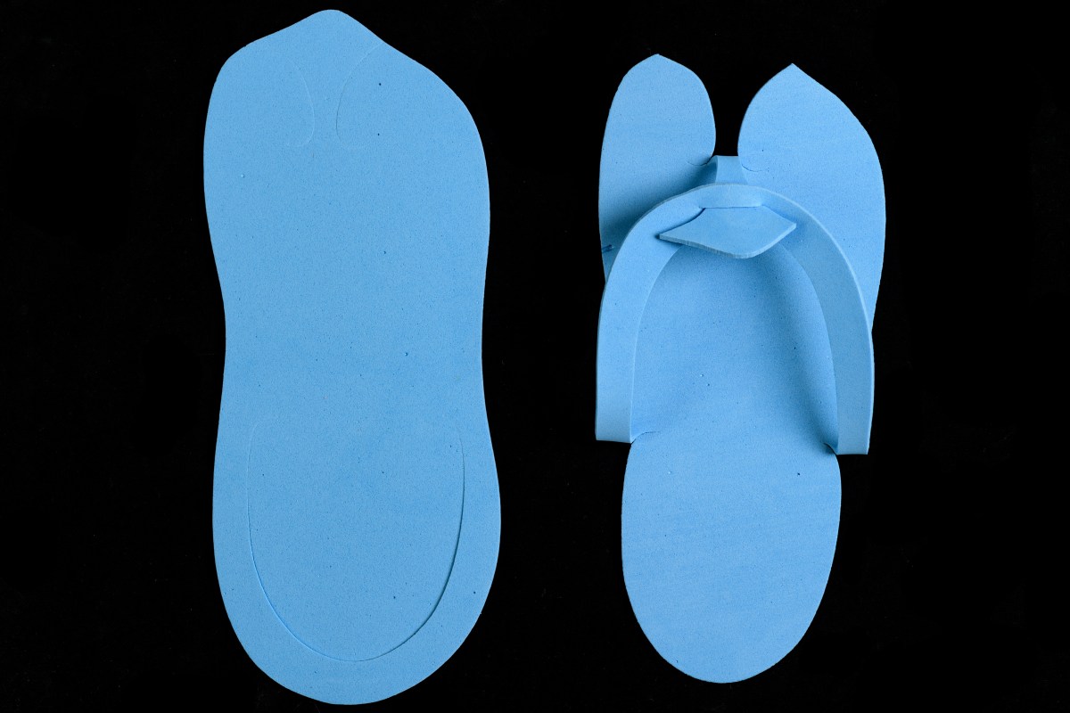 Single-use flip-flips, maker unknown, 2010’s. Unidentified plastic foam sheeting. Collection, Katherine C. Grier. – (Evan Krape / University of Delaware)