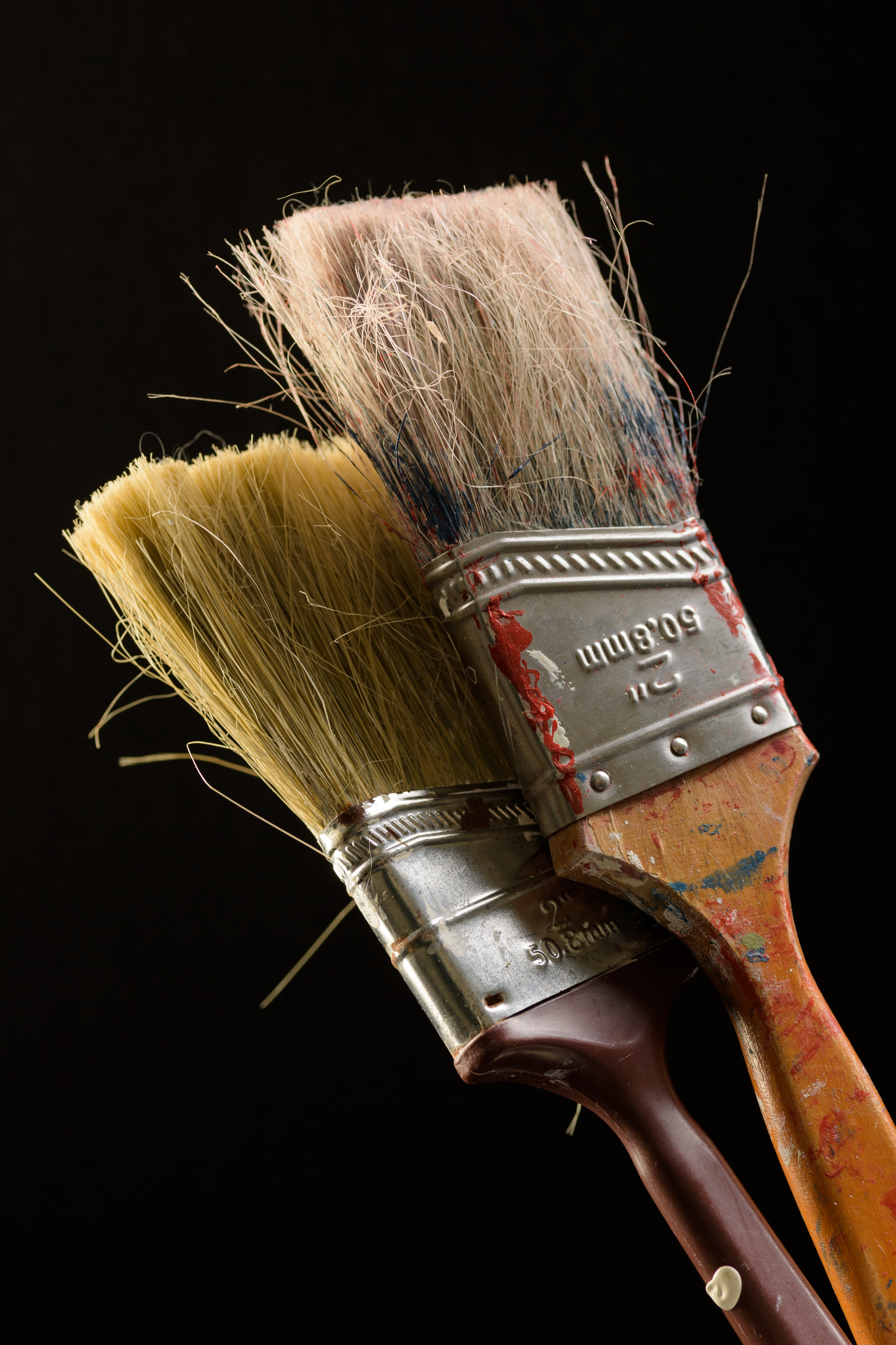 Paint brushes, maker unknown, year unknown. Wooden handle, polyester or nylon bristles, and an unknown metal ferrule. Collection, Katherine C. Grier. – (Evan Krape / University of Delaware)