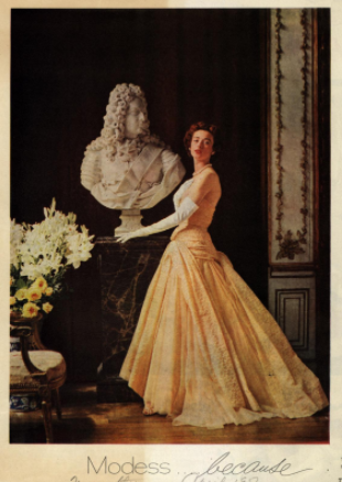 This successful advertising campaign ran from 1948 through the 1970s, using couture clothes, modeling icons, and palatial settings to convince women that Modess pads were the link between themselves and the glamorous lifestyle depicted. Pads are mentioned nowhere, disconnecting the viewer from the reality of menstruation.