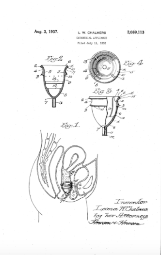 Patent drawing for the Chalmers Menstrual Cup, Leona Chalmers, 1937.