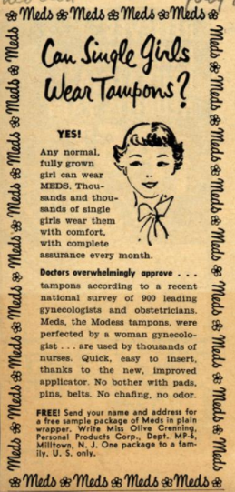 Starting with Cashay in 1930, whose instructions recommended that their product was not for virgins, tampons raised concerns about physical damage to the hymen. Popular wisdom said tampons threatened the wearer’s virginity. While tampons attempted to decrease embarrassment, the sexual stigma linked to them could heighten self consciousness and fuel the need for secrecy when buying and using tampons. Makers like Modess had to fight these ideas via advertising.