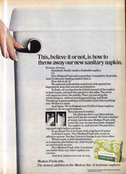 Companies struggled for years to create a truly “flushable” pad, as that seemed to be the easiest, most private way for women to dispose of used menstrual products. Even later efforts to develop a flushable pad, like the Modess Flush-able, failed. The pads clogged plumbing, and women often flushed non-biodegradable materials such as pad wrappers and tampon applicators.