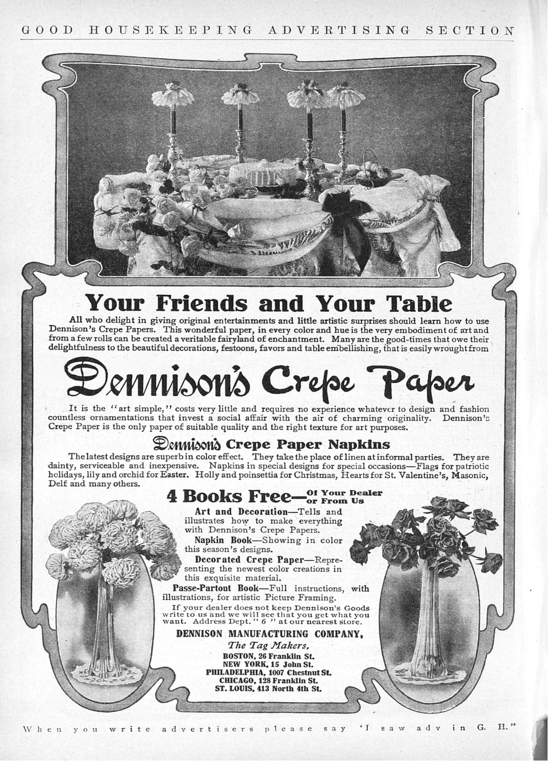 Full page Dennison Manufacturing Company advertisement for crepe paper in Good Housekeeping, March 1906